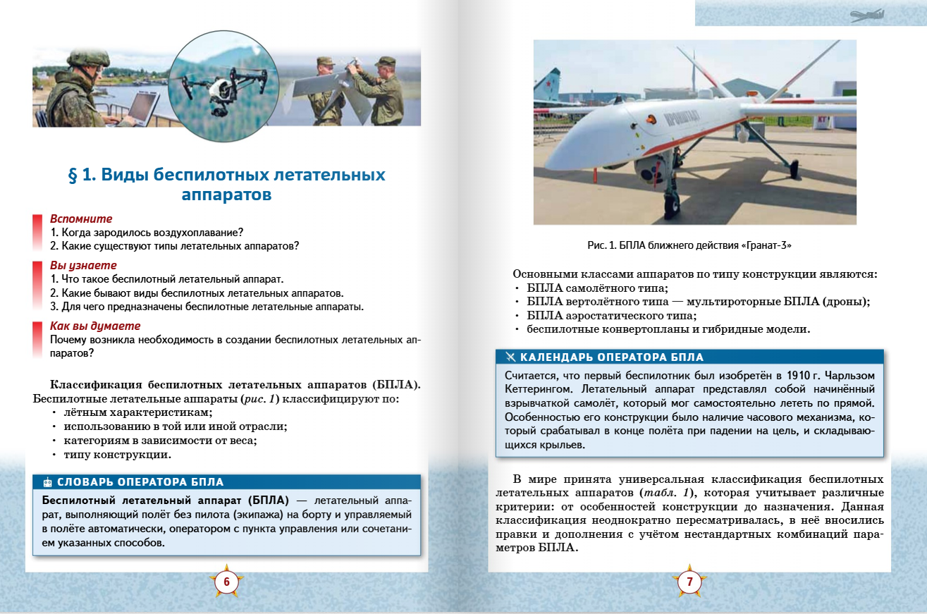 Учебное пособие «Беспилотные летательные аппараты: основы конструкции и управления» предназначен для воспитанников 8 класса суворовских военных училищ, Нахимовского военно-морского училища, кадетских военных корпусов, президентских кадетских училищ, кадетских (морских кадетских) классов и специализированных инженерных классов общеобразовательных организаций. В учебном пособии изложены основные сведения об истории и развитии беспилотных летательных аппаратов (БПЛА), их видовом разнообразии и областях применения, а также даны законодательная база и основы их использования.