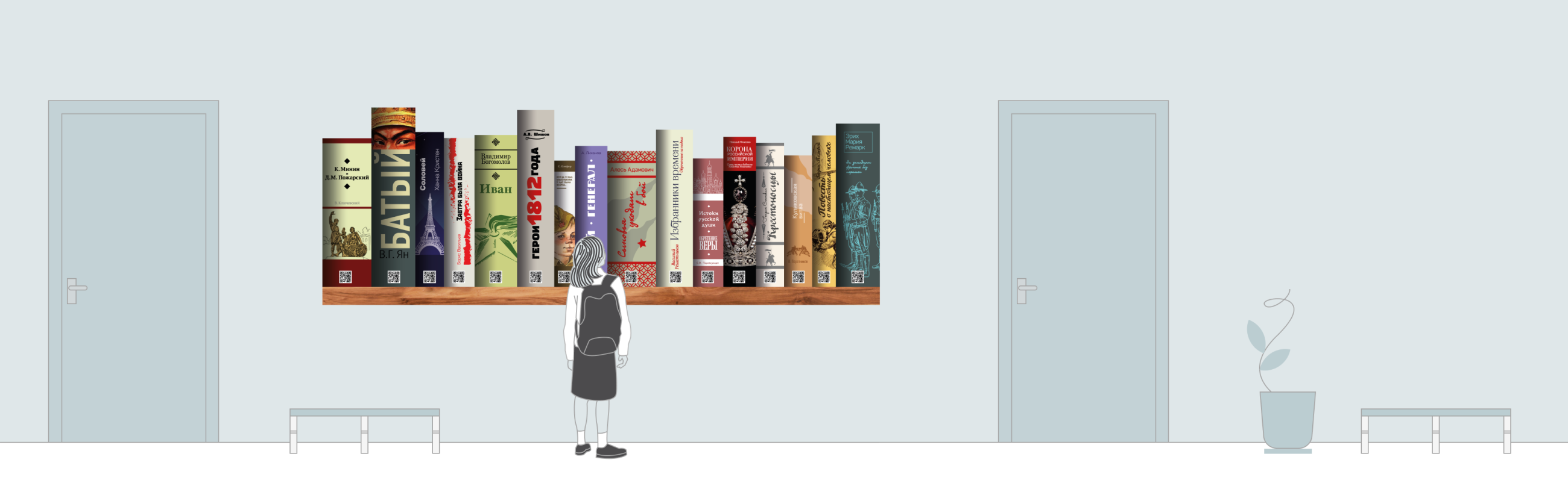 Совместный проект с ЛитРес: Библиотека. Это проект предоставляет школам доступ к мобильной библиотеке с возможностью дистанционно выдавать электронные книги. Мы нарисовали книжную полку из книг из рекомендации Министерства образования и науки РФ из письма № 08-709 от 14.04. 2016. Книги гражданско-патриотической направленности для 5-11 классов. Всего 16 книг.