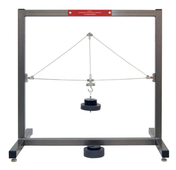 Стенд представляет собой сварное основание, установление на регулируемых отводах, которые предназначены для горизонтальной установки комплекса на рабочий стол. На основании установлен участок фермы, который выполнен из стальных шпилек диаметром 3 мм. Снизу имеется точка подвеса для установки грузов. В комплект входят 5 грузов по 500 гр и 3 груза по 200 гр. Шпильки могут быть легко заменены на новые (в комплект поставки входит несколько запасных шпилек).