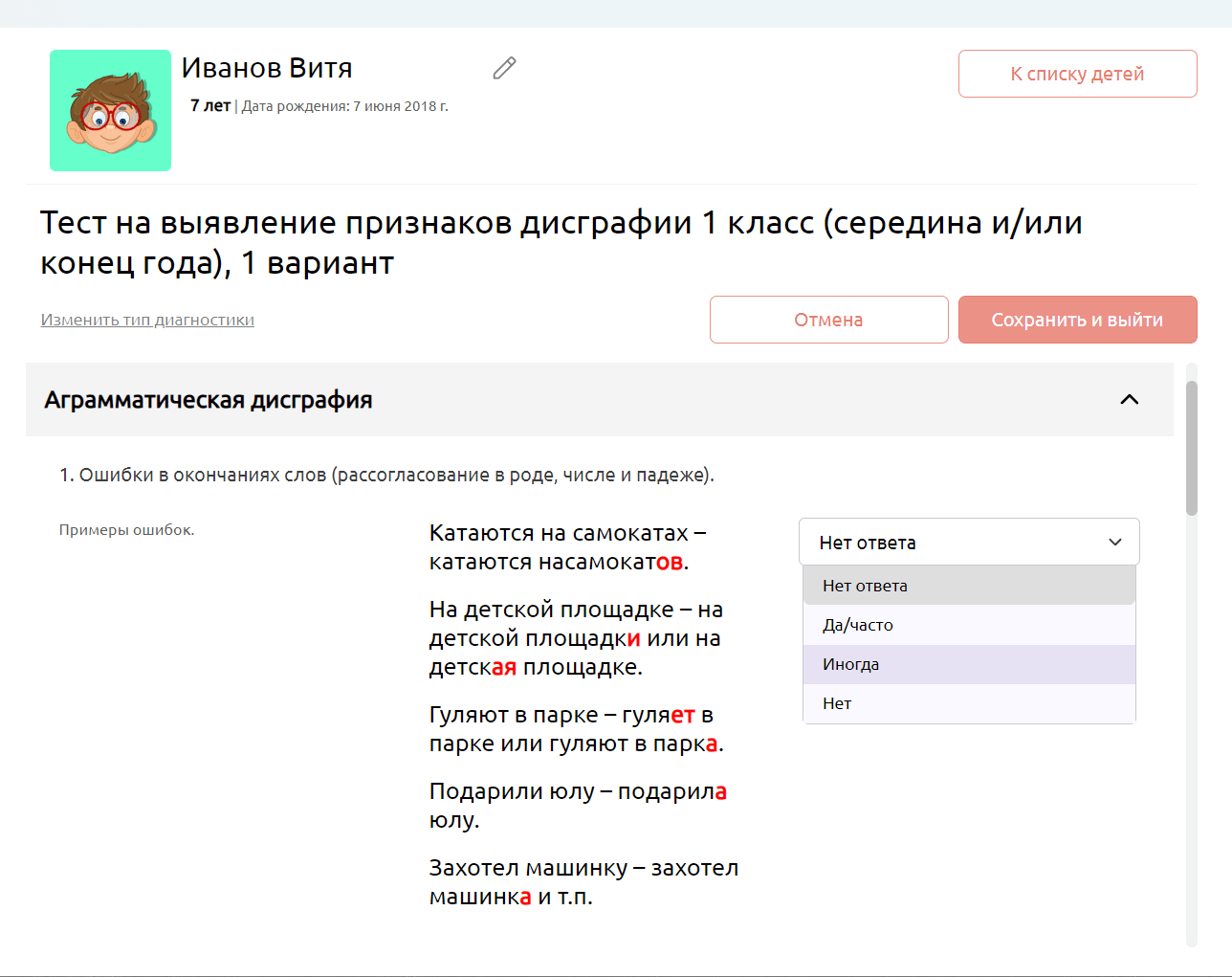«ЛогоКонсул Школа» — ваш цифровой помощник в проведении логопедических обследований. Он подсветит проблемные зоны, поможет найти причины дисграфии и дислексии, возьмет на себя рутинные задачи: подбор заданий, фиксирование отметок, подготовка речевой карты к печати и т.д.