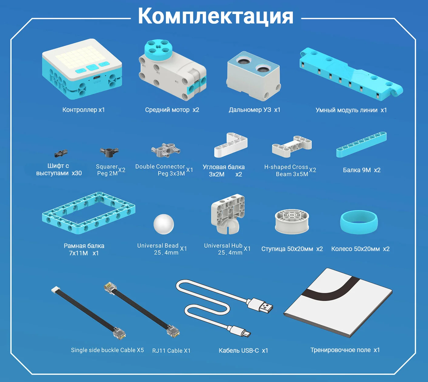- контроллер M5-RCU (ОЗУ 8Мб, матричный дисплей 5х7 элементов, 2 порта моторов, 3 порта датчиков, разъемы - RJ-12, аккумулятор Li 3.7В 800мАч, разъем USB-C) – 1 шт