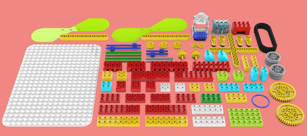 - 75 деталей для сборки моделей (совместимых с Лего Duplo): блоки, колеса, шестерни, червячная передача, шкивы, оси, гусеница и т.д.