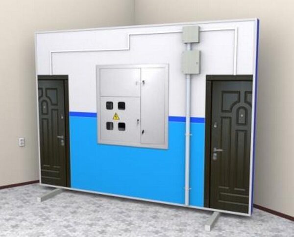 Лабораторный стенд с трубами для прокладки и распределительной коробкой для установки на этаже в жилом многоэтажном доме (для подключения до 16-ти абонентов к общей оптической сети).
