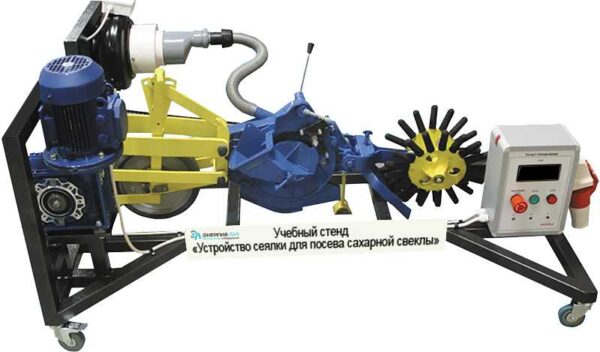 Стенд представляет собой секцию сеялки для посева свеклы, закрепленную на металлическом основании с электроприводом, вентилятором и панелью управления.