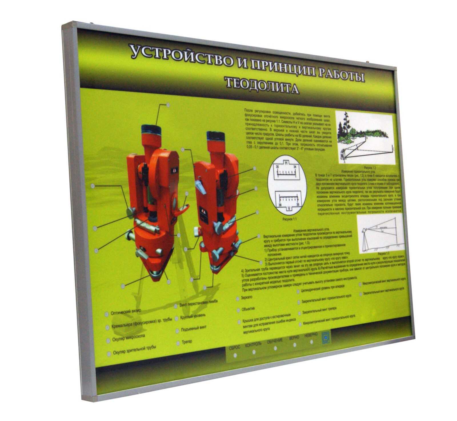 Стенд-планшет светодинамический предназначен для изучения принципа работы теодолита, в профильных учебный заведениях начального и среднего профессионального образования.