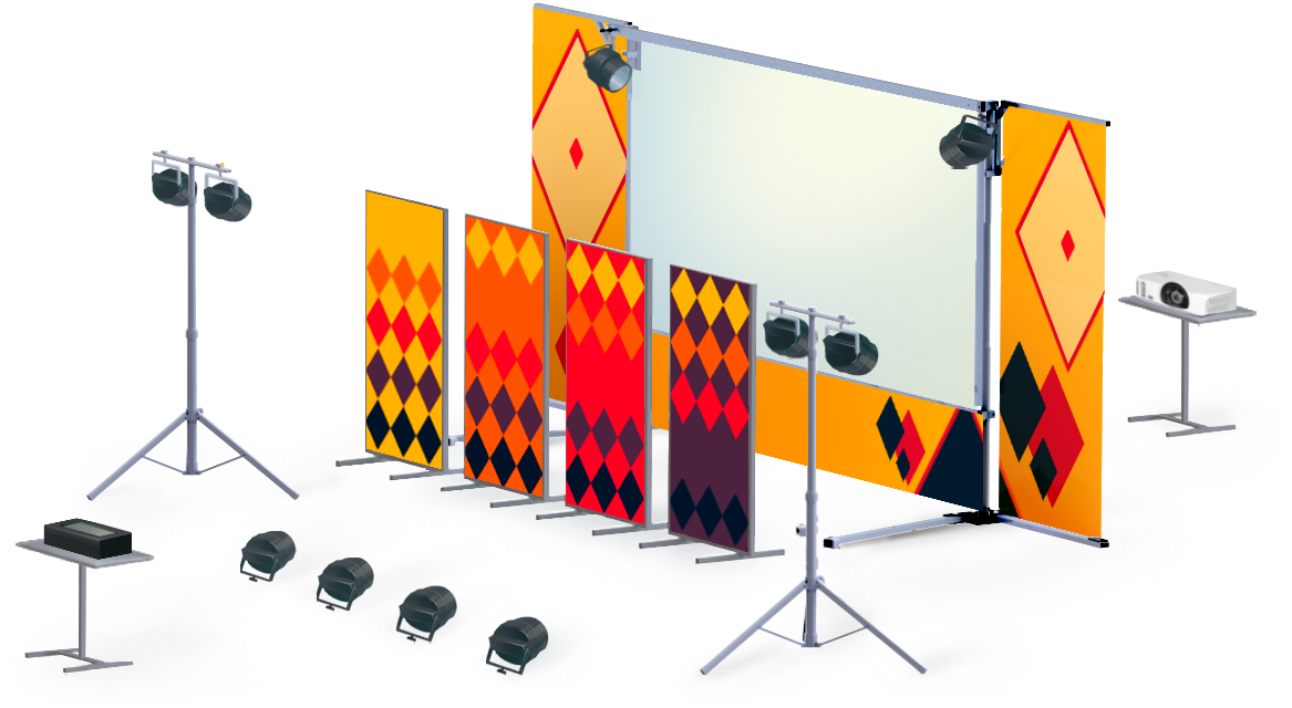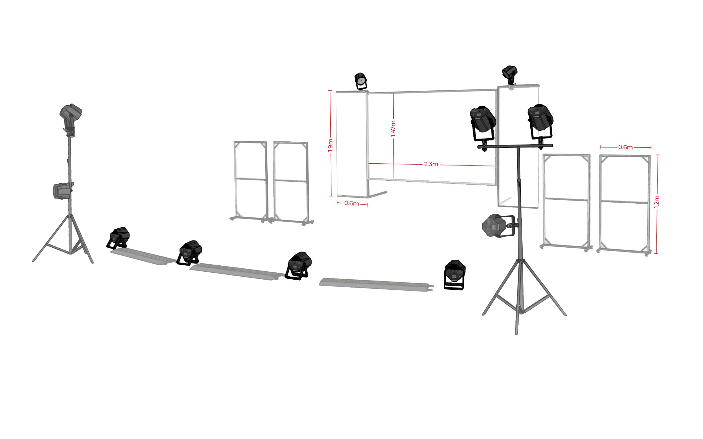 - Световое оборудование: 12 прожекторов DMX со светофильтрами, штативы для осветительных приборов;